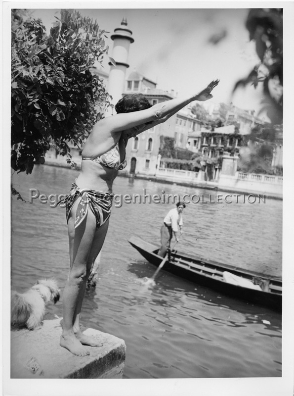 Peggy Guggenheim with her Lhasa Apsos terriers on the terrace of Palazzo Venier dei Leoni, Venice, early 1950s