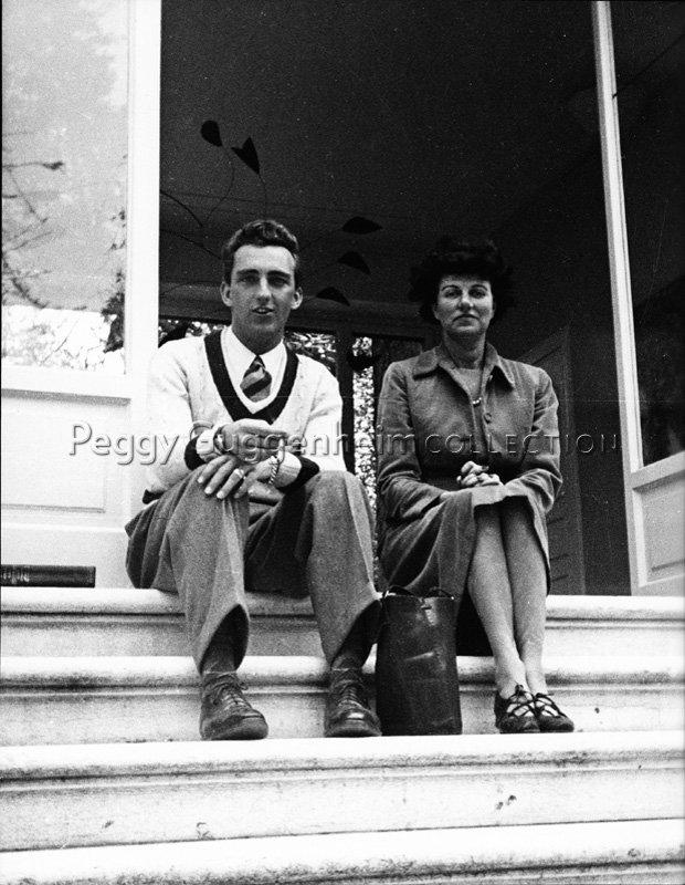 Peggy Guggenheim con un giovane amico, seduta sulle scale d'ingresso a Palazzo Venier dei Leoni; Venezia, 1949.