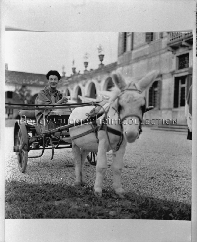 Peggy Guggenheim su un calessino trainato da un pony bianco, ospite di alcuni amici a Villa Condulmer, a Zerman di Mogliano Veneto. Anni '50