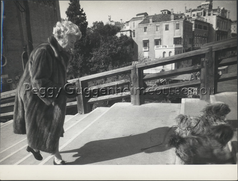 Peggy Guggenheim in pelliccia, passeggia con una coppia dei suoi Lhasa Apsos, sul ponte dell'Accademia; Venezia, anni '60