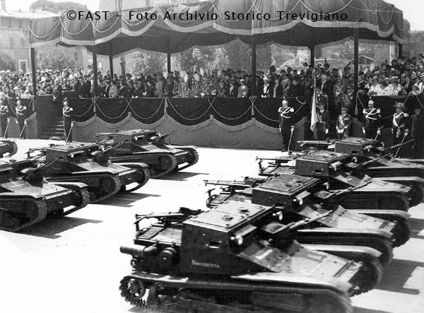Il Re, Badoglio e lo stato maggiore dell'esercito assistono alla parata dei carri armati