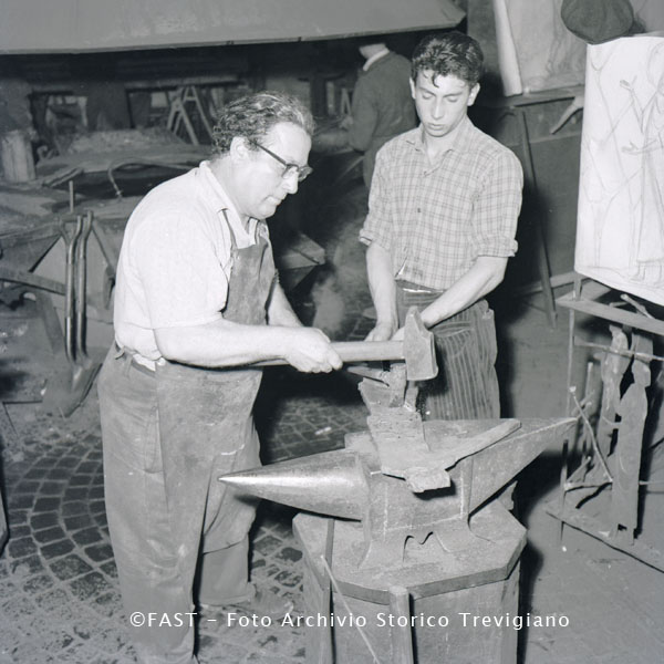Toni Benetton e un lavorante mentre lavorano ad una scultura in ferro battuto
