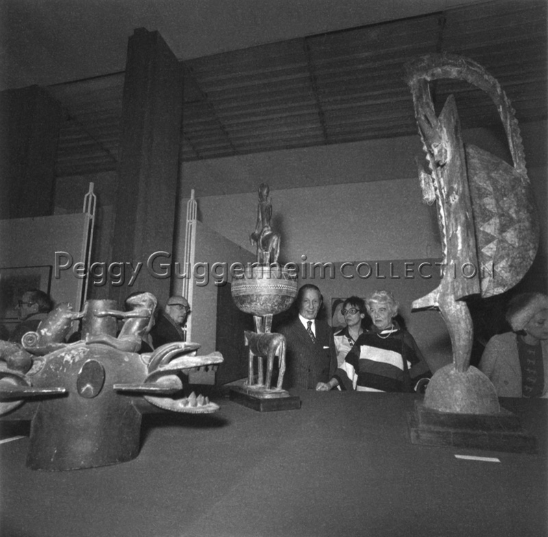 Peggy Guggenheim e altri durante l'inaugurazione della mostra dedicata alla Collezione Peggy Guggenheim, presso la Galleria Civica d'Arte Moderna di Torino, dal dicembre 1975 al febbraio 1976