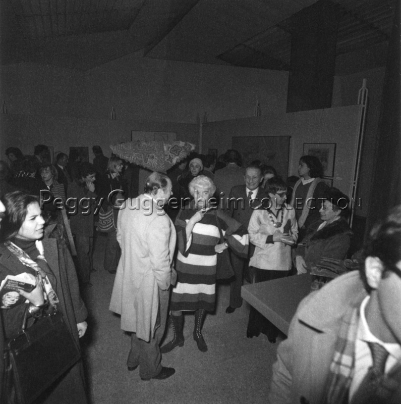 Peggy Guggenheim e altri durante l'inaugurazione della mostra dedicata alla Collezione Peggy Guggenheim, presso la Galleria Civica d'Arte Moderna di Torino, dal dicembre 1975 al febbraio 1976