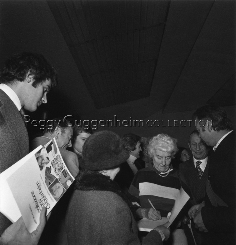 Peggy Guggenheim mentre autografa i cataloghi durante l'inaugurazione della mostra dedicata alla Collezione Peggy Guggenheim, presso la Galleria Civica d'Arte Moderna di Torino, dal dicembre 1975 al febbraio 1976