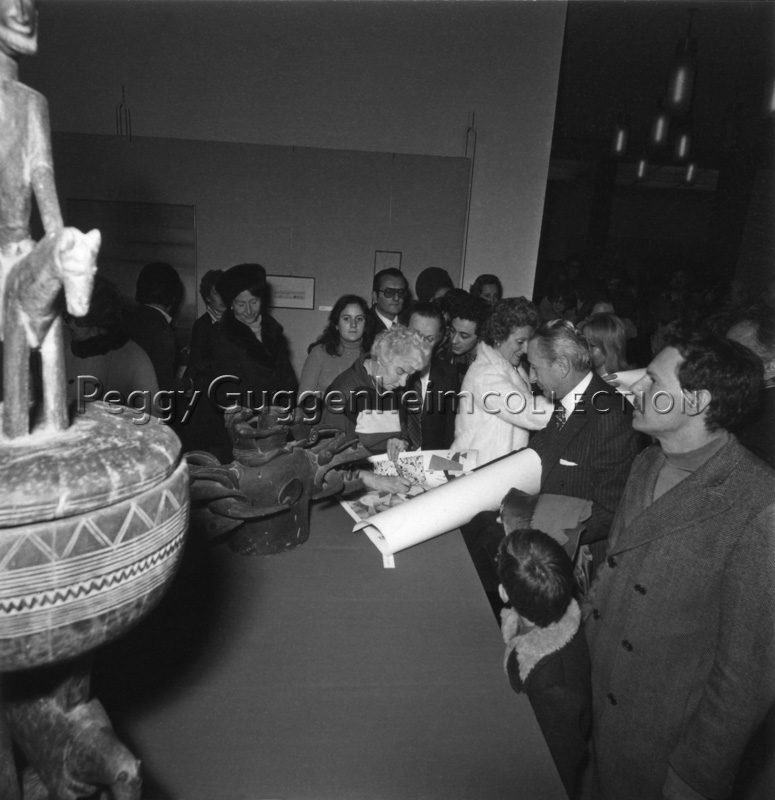 Peggy Guggenheim mentre autografa i cataloghi durante l'inaugurazione della mostra dedicata alla Collezione Peggy Guggenheim, presso la Galleria Civica d'Arte Moderna di Torino, dal dicembre 1975 al febbraio 1976