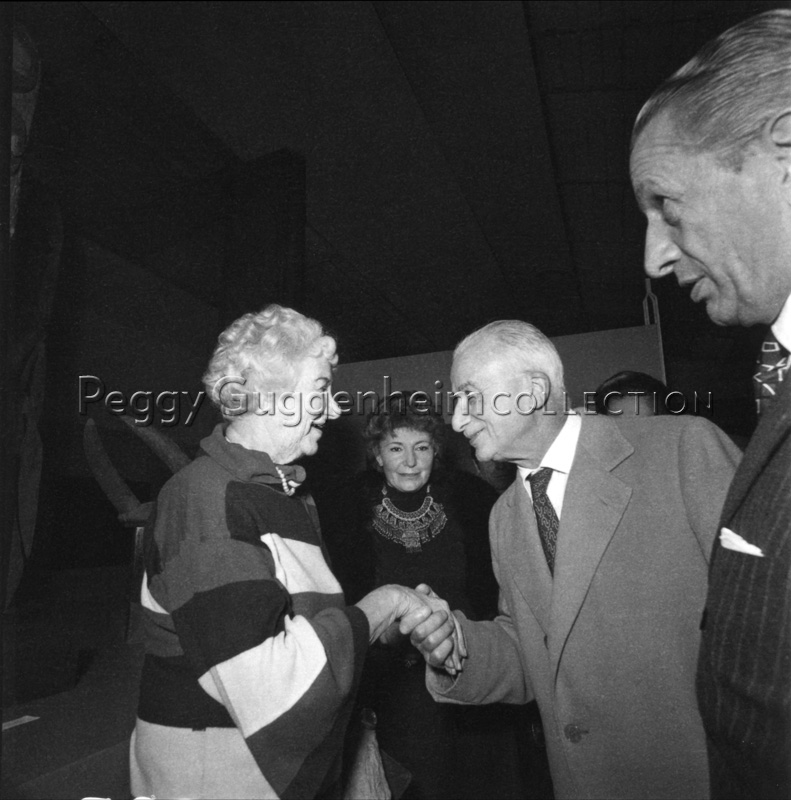 Peggy Guggenheim e altri durante l'inaugurazione della mostra dedicata alla Collezione Peggy Guggenheim, presso la Galleria Civica d'Arte Moderna di Torino, dal dicembre 1975 al febbraio 1976