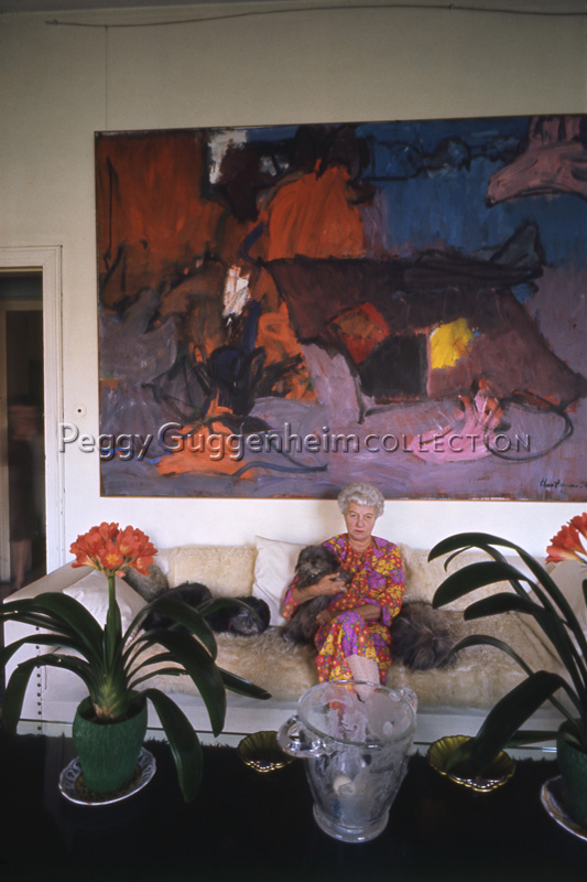 Peggy Guggenheim in salotto a Palazzo Venier dei Leoni; alle sue spalle, il dipinto di Grace Hartigan, "Ireland" (1958); Venezia, 1975.