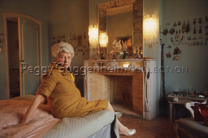 Peggy Guggenheim nella sua camera di Palazzo Venier dei Leoni. Sullo sfondo, ai lati del caminetto, è appuntata la sua collezione di orecchini. Venezia, 1975