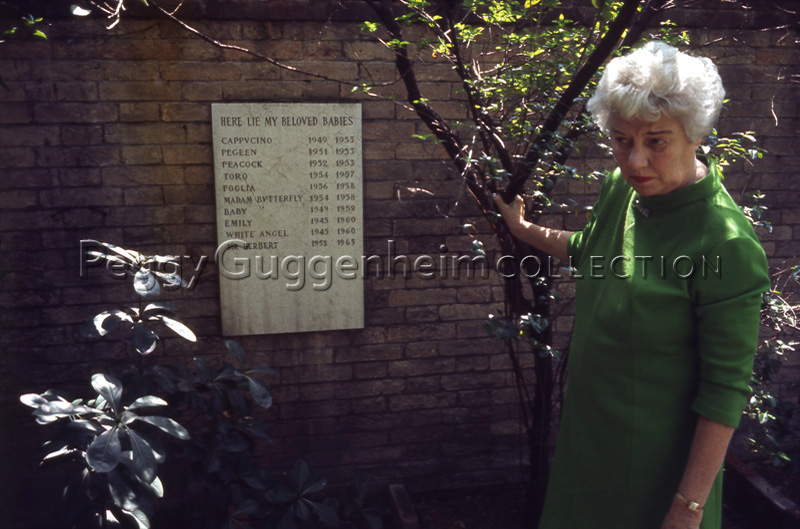 Peggy Guggenheim accanto alla lapide che identifica il luogo di sepoltura dei suoi cani, nel giardino di Palazzo Venier dei Leoni. Venezia, 1975