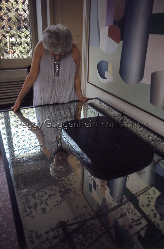 Peggy Guggenheim nella sala d'ingresso di Palazzo Venier dei Leoni, si specchia sulla superficie del tavolo, su cui è posata la scultura di Giacometti, "Modello per una piazza" (1931-32); alla parete è appeso il dipinto di Hélion, "Composizione (Composition)" (1935). Venezia, 1975