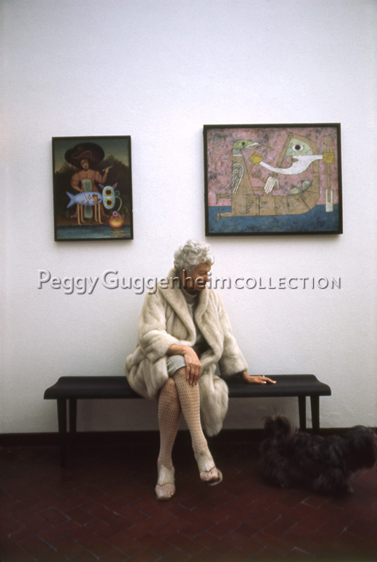 Peggy Guggenheim nella barchessa di Palazzo Venier dei Leoni, appesi sopra di lei due dipinti di Victor Brauner: da sinistra, "Il surrealista" (1947) e "Coscienza dello shock" (1951). Venezia, 1975