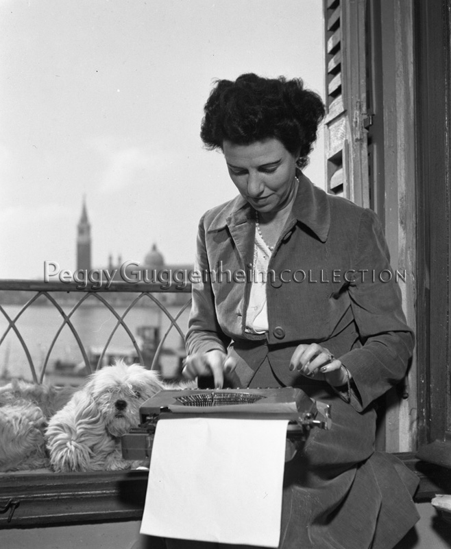 Peggy Guggenheim at her typewriter in her room at the Hotel Savoia & Jolanda, along Riva degli Schiavoni, Venice, 1949