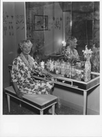 Peggy Guggenheim in her bedroom at Palazzo Venier dei Leoni; on the dressing table two bottles by Laurence Vail; on the wall her collection of earrings; Venice, 1973