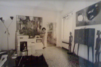 Peggy Guggenheim in the living room of Palazzo Venier dei Leoni; on the walls (left to right) Edmondo Bacci, "Factory" (1952, unknown location), "Event #292" (1958, PGC); on the table Joseph Cornell, "Fortune Telling Parrot" (1937-38 ca., PGC); Venice, early 1960s.