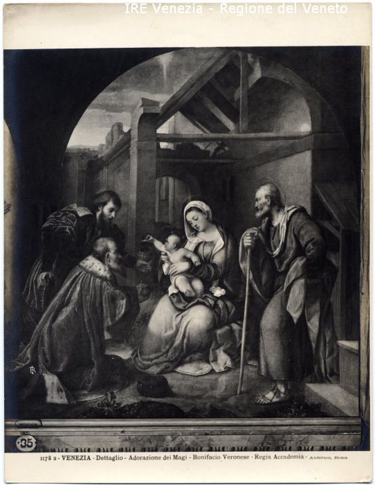 - ISCRIZIONI sul recto: in basso - 11782 - VENEZIA - Dettaglio - Adorazione dei Magi - Bonifacio Veronese - Regia Accademia - Anderson, Roma - fotografica -