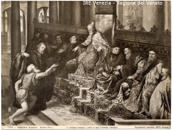 - ISCRIZIONI sul recto: in basso - 1188 - VENEZIA - R. Accademia - Bordone Paris/ Il pesacatore consegna l'anello al Doge Gradenigo (dettaglio)/ (Riproduzione interdetta) NAYA Venezia - fotografica -