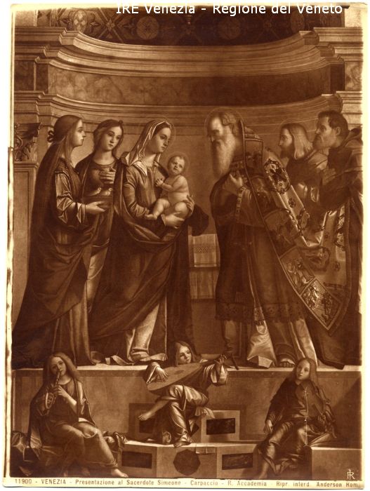- ISCRIZIONI sul recto: in basso - 11900 - VENEZIA - Presentazione al Sacerdote Simeone - Carpaccio - R. Accademia - Ripr. interd. - Anderson Roma - a matita -
