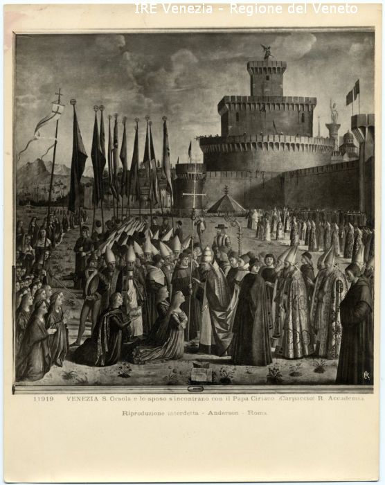 - ISCRIZIONI sul recto: in basso - 11919 - VENEZIA S. Orsola e lo sposo s'incontrano con il Papa Ciriaco (Carpaccio) R. Accademia/ Riproduzione interdetta - Anderson - Roma - a penna -