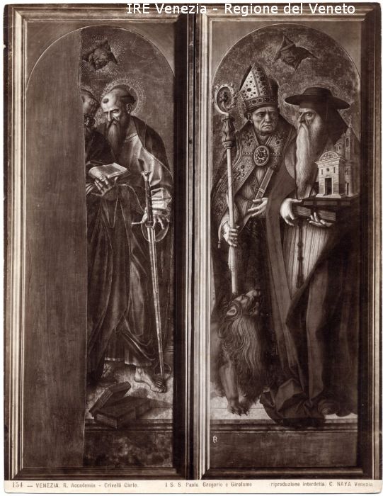 - ISCRIZIONI sul recto: in basso - 154 - VENEZIA. R. Accademia - Crivelli Carlo./ I. S. S. Paolo, Gregorio e Girolamo/ (riproduzione interdetta) C. NAYA Venezia - fotografica -