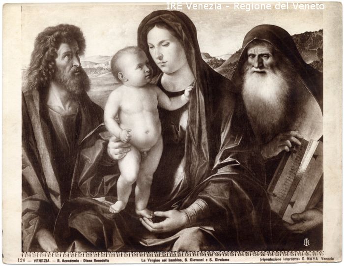 - ISCRIZIONI sul recto: in basso - 124 - VENEZIA. - R. Accademia - Diana Benedetto/ La Vergine col bambino, S. Giovanni e S. Girolamo/ (riproduzione interdetta) C. NAYA. Venezia - fotografica -