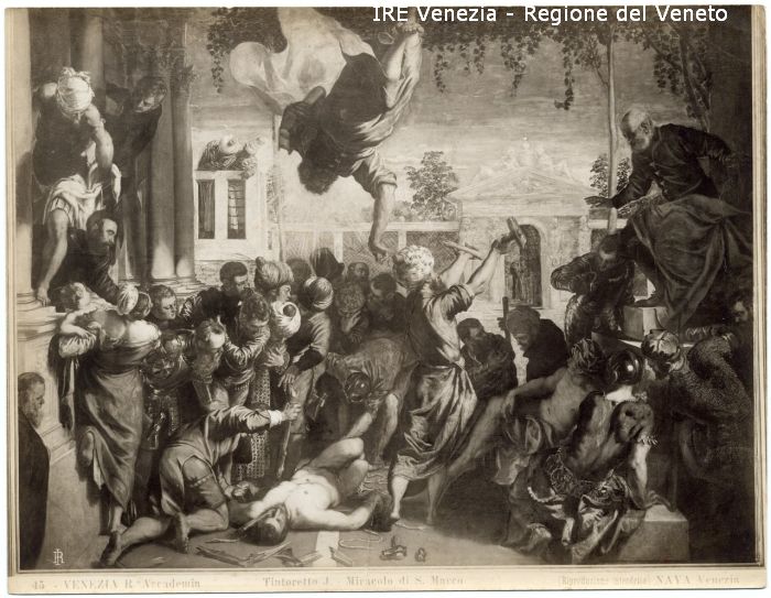 - ISCRIZIONI sul recto: in basso - 45 - VENEZIA R. Accademia/ Tintoretto J. - Miracolo di S. Marco / [Riproduzione interdetta] NAYA Venezia - fotografica -