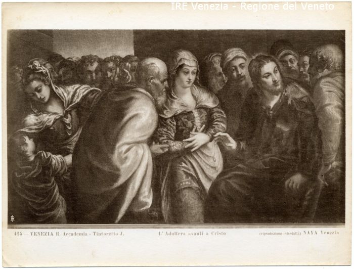 - ISCRIZIONI sul recto: in basso - 425 - VENEZIA R. Accademia - Tintoretto J./ L'Adultera avanti a Cristo/ (riproduzione interdetta) NAYA Venezia - fotografica -