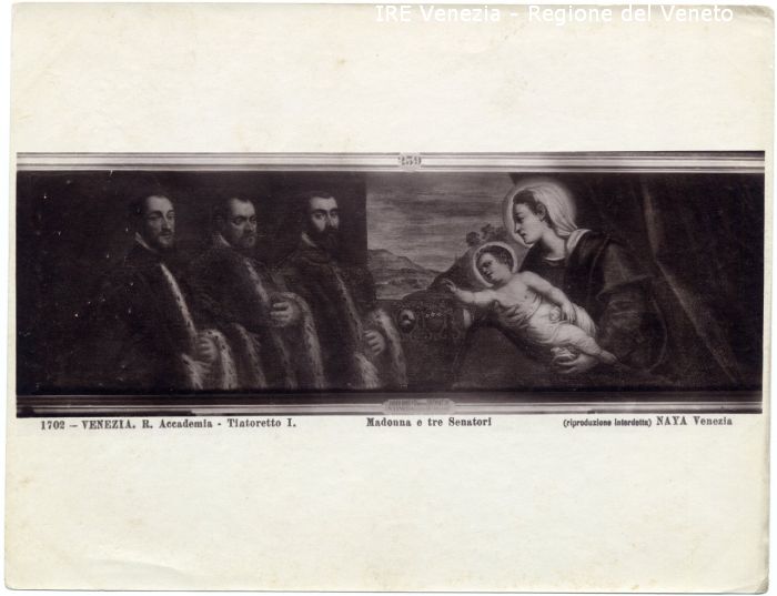 - ISCRIZIONI sul recto: in basso - 1702 - VENEZIA. R. Accademia - Tintoretto I./ Madonna e tre Senatori/ (riproduzione interdetta) NAYA Venezia - fotografica -