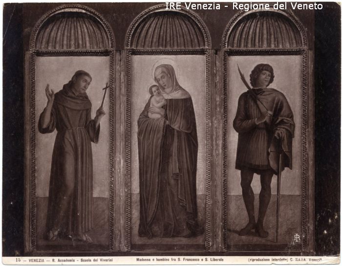 - ISCRIZIONI sul recto: in basso - 15 - VENEZIA - R. Accademia - Scuola dei Vivarini/ Madonna e bambino fra S. Francesco e S. Liberale/ (riproduzione interdetta) C. NAYA Venezia - fotografica -