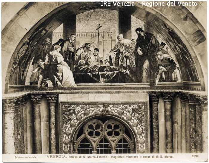 - ISCRIZIONI sul recto: in basso - Edizione inalterabile./ VENEZIA - Chiesa di S. Marco - Esterno - I magistrati venerano il corpo di S. Marco./ 3590 - fotografica -