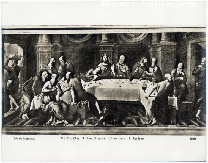 - ISCRIZIONI sul recto: in basso - Edizione inalterabile./ VENEZIA. S. Giov. Bragora. Ultima cena. P. Bordone./ 3510 - fotografica -