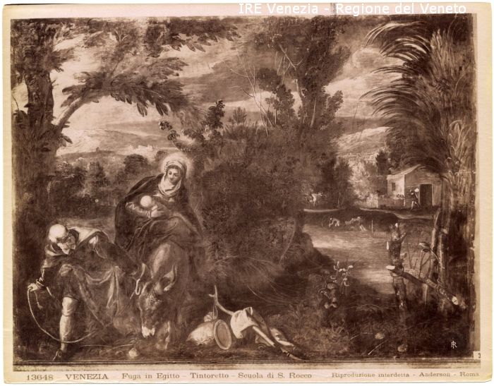 - ISCRIZIONI sul recto: in basso - 13648 - VENEZIA - Fuga in Egitto - Tintoretto - Scuola di S. Rocco/ Riproduzione interdetta - Anderson - Roma. - fotografica -