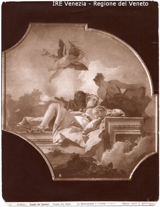 - ISCRIZIONI sul recto: in basso - 778 - VENEZIA Scuola dei Carmini Tiepolo Gio Batta. La Mansuetudine e l'Umiltà (soffitto)/ (Riprod. interd. C. NAYA Venez - fotografica -