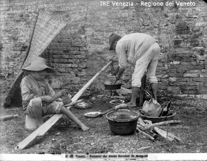 Venezia - Vita veneziana e lagunare - Scene e costumi- Sestiere di Castello ? - Due pescatori: che preparano da mangiare - Un prato - Un vecchio muro - Un remo rotto - Pentolame - Cesti - Piatti con sardine - Una stuoia