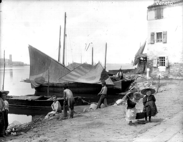 Sottomarina, barche da pesca e bambini su una riva