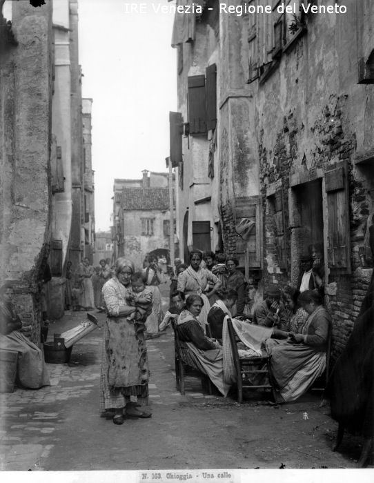 Chioggia (Venezia) - Vita veneziana e lagunare - Scene di vita quotidiana - Una calle - Popolani fuori dalle abitazioni - Donne che lavorano al redin - Anziana con bambino in braccio - Secchio per il bucato - Vecchie case (esterni)