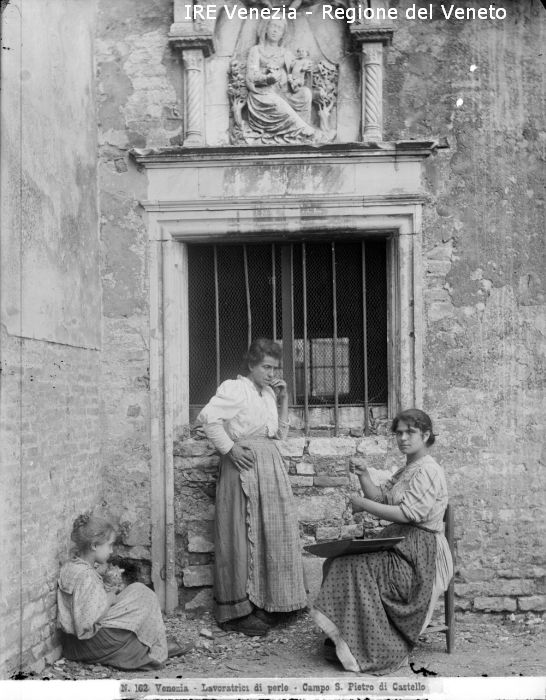 Venezia - Vita veneziana e lagunare - Scene e costumi - "D'après nature" - S. Piero di Castello - Infilatrici di perle - Impiraresse