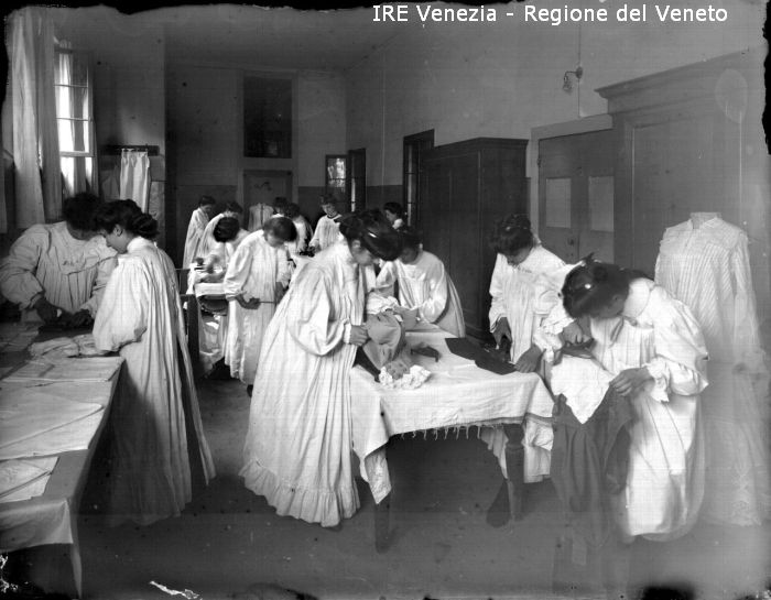 Venezia, scuola professionale femminile per il commercio, allieve che stirano