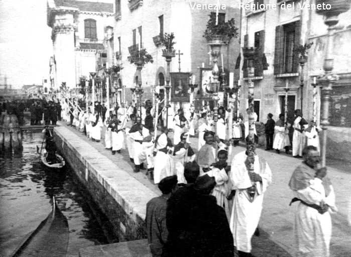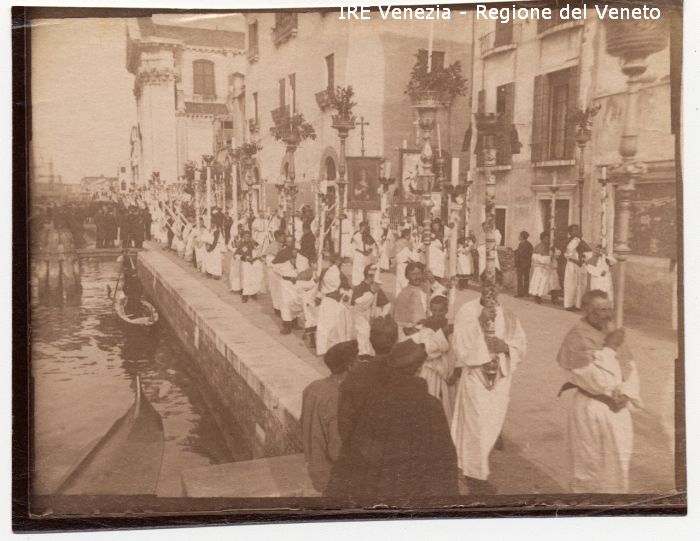 Venezia - Vita veneziana e lagunare - Manifestazioni religiose - Processione del Corpus Domini - Zattere: fondamenta, verso la chiesa di S. Maria del Rosario vulgo Gesuati - Corteo - Officianti - Aste portacero - Vessilli - Folla