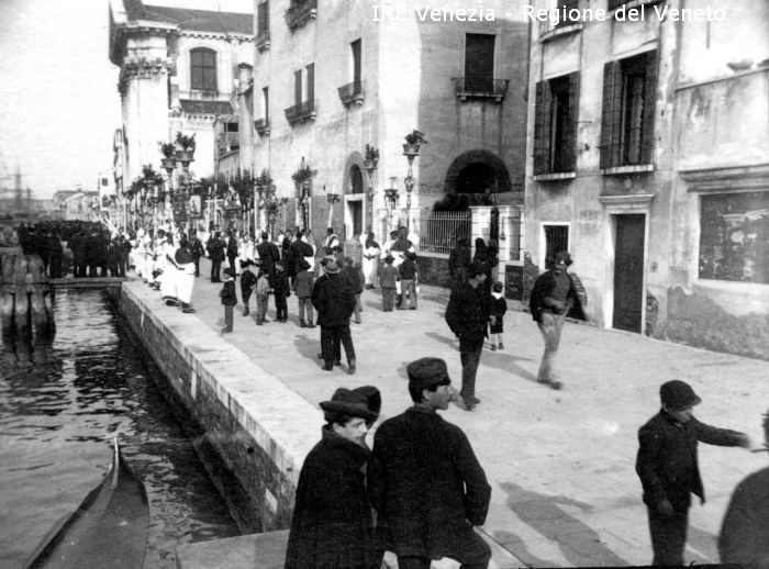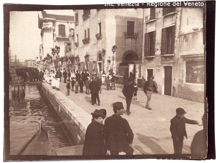 Venezia - Vita veneziana e lagunare - Scene e costumi - Manifestazioni religiose - Processione del Corpus Domini - Zattere: fondamenta, verso la chiesa di S. Maria del Rosario vulgo Gesuati - Preparativi - Folla - Officianti - Aste liturgiche