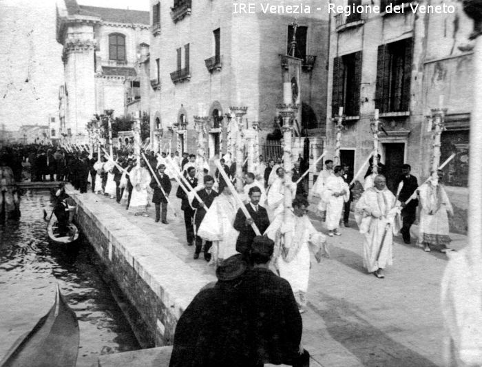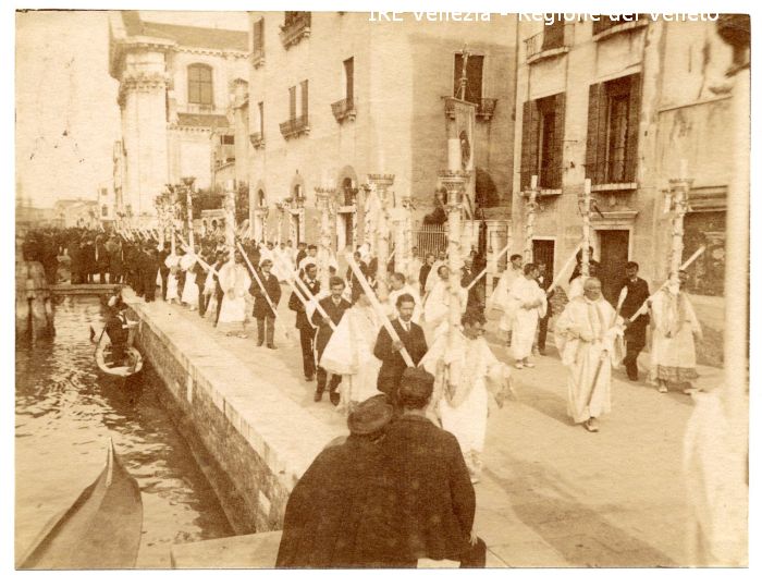 Venezia - Vita veneziana e lagunare - Manifestazioni religiose - Processione del Corpus Domini - Zattere: fondamenta, verso la chiesa di S. Maria del Rosario vulgo Gesuati - Partenza del corteo - Officianti - Folla - Vessilli - Aste portacero
