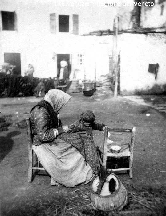 Vita veneziana e lagunare - Territorio di Chioggia - Esterno - Una anziana donna: seduta, con una bambina piccola - Sedie di legno e paglia - Abitazioni popolari - Reti da pesca stese ad asciugare