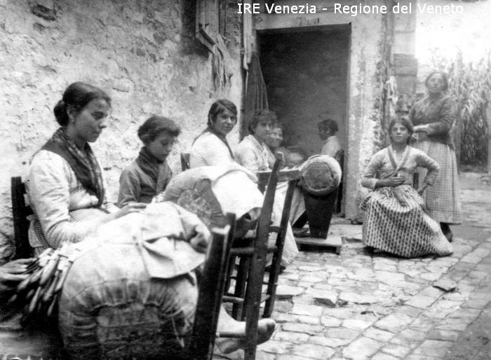 Venezia - Vita veneziana e lagunare - Scene e costumi - Momenti di vita quotidiana - Produzione di merletti - Località non identificata (Murano ?) - Corte - Donne: al tombolo - Merlettaie