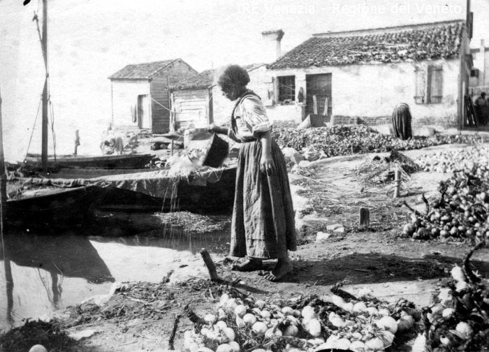 Venezia - Vita veneziana e lagunare - Territorio di Chioggia - Scene di vita quotidiana - Una riva - Una ragazza: in piedi, di profilo; che versa acqua - Abitazioni di pescatori - Cipolle - Imbarcazioni