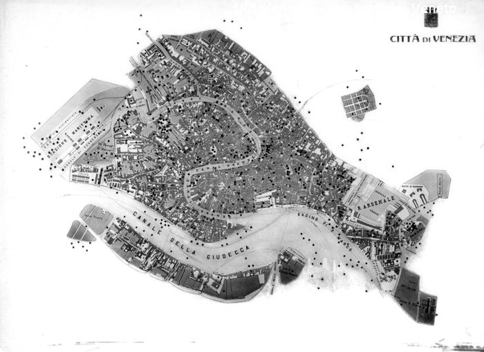 Mappa con le indicazioni dei luoghi colpiti dalle bombe : Venezia