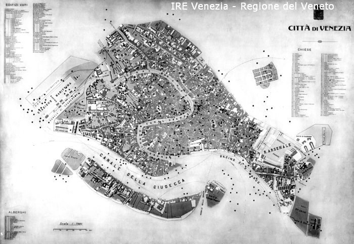 Iscrizioni: "Città di Venezia" [con stemma della città]; "Edifizi vari" [segue elenco]; "Alberghi" [segue elenco]; "Chiese" [segue elenco]