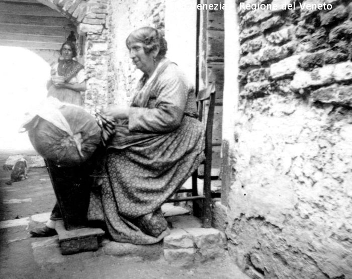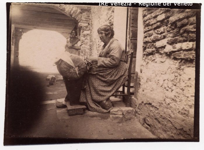 Venezia - Vita veneziana e lagunare - Scene e costumi - Produzione di merletti - Località non identificata (Murano ?) - Soglia di abitazione - Merlettaia - Donna: al tombolo