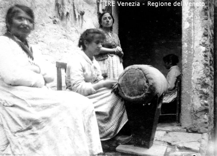 Venezia - Vita veneziana e lagunare - Scene e costumi - Momenti di vita quotidiana - Produzione di merletti - Località non identificata (Murano ?) - Soglia di abitazione - Donne al tombolo - Merlettaie