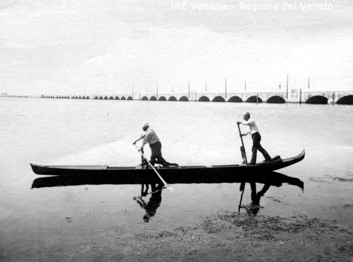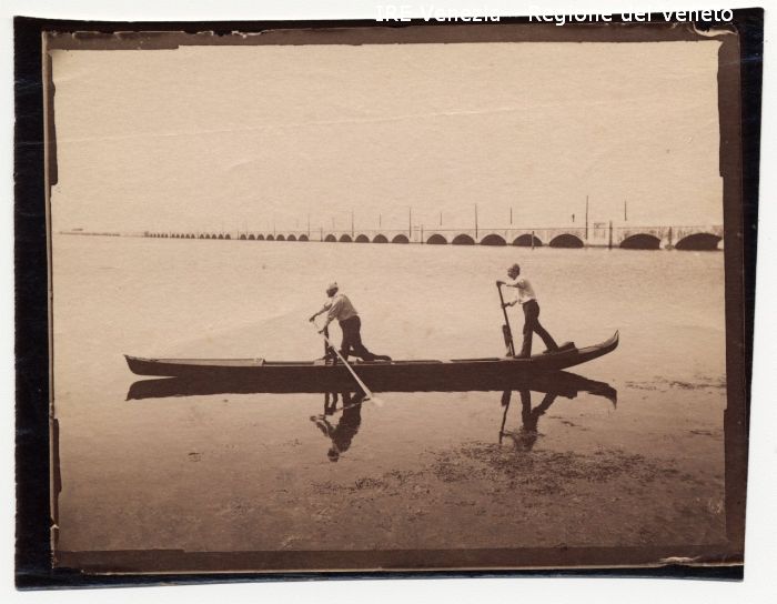 Venezia - Vita veneziana e lagunare - Scene di genere - Modelli in posa: in esterni - Laguna di Venezia - Ponte ferroviario - Imbarcazione: tipo di gondola - Rematori
