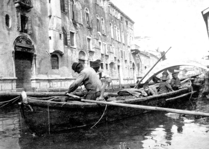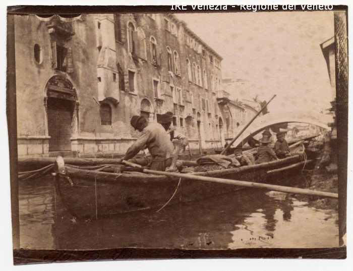 Venezia - Vita veneziana e lagunare - Momenti di vita quotidiana - Rio della Madonna dell'Orto ? - Imbarcazione: peata - Uomini e bambini a bordo - Remi - Ponte - Abitazioni: esterni